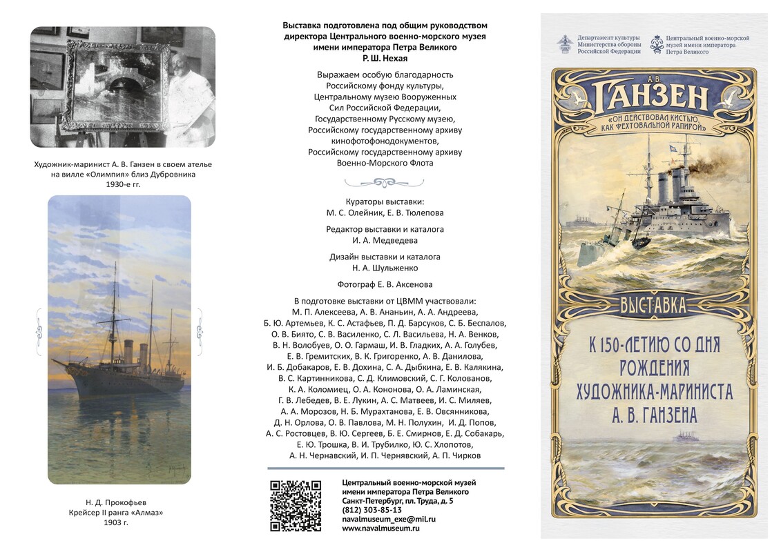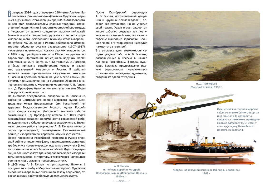 Экспозиция раскрывает творческий путь Алексея Васильевича Ганзена официального живописца Морского министерства, внука великого Ивана Айвазовского.