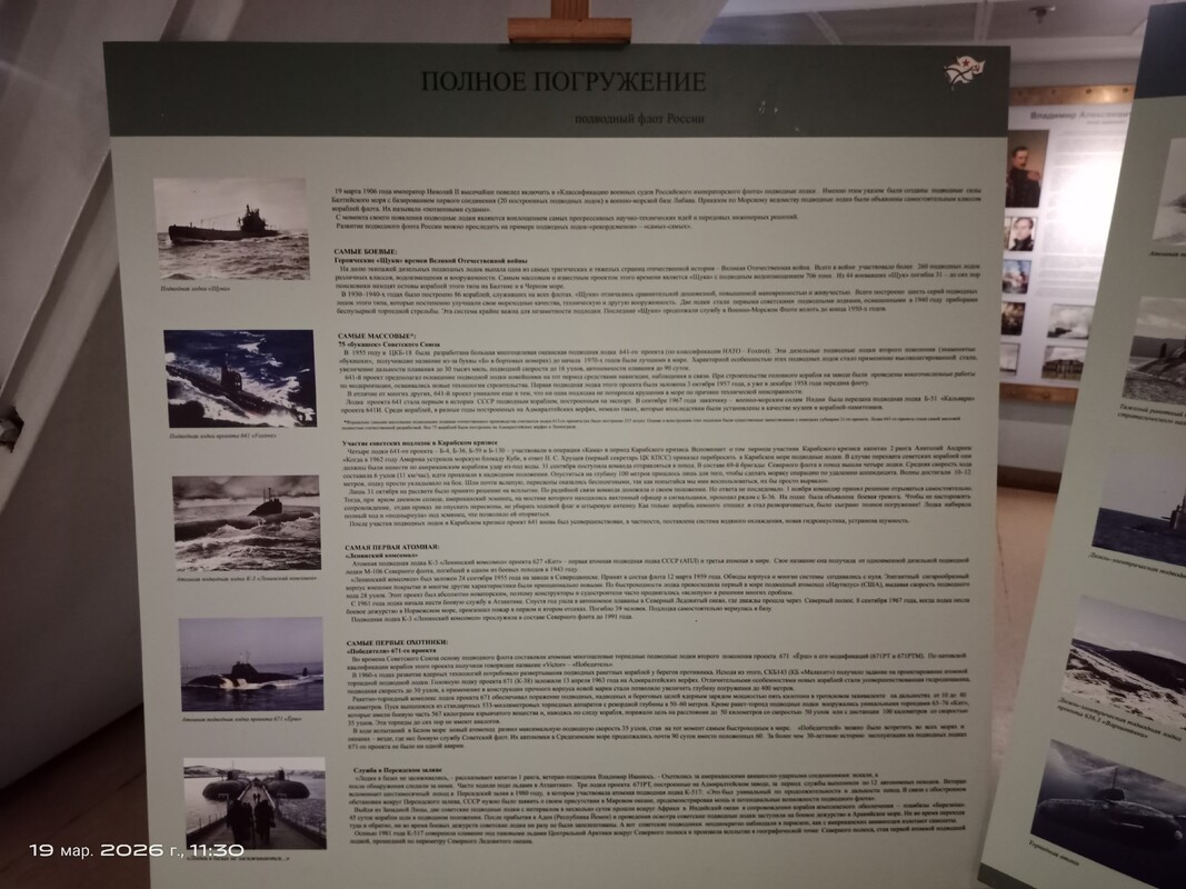 В информационно-историческом пространстве филиала Центрального военно-морского музея имени императора Петра Великого на крейсере "Аврора " открылась электронно- плоскостная выставка, посвященная 120-летию создания подводных сил Российского флота. Большое количество информации о подводных лодках, о подвигах моряков-подводников, об их повседневной службе, о радостях, традициях и горестях смелых и сильных людей будет интересна всем посетителям филиала.