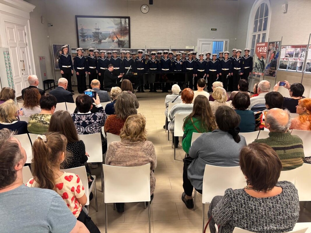 Перед многочисленной публикой, в состав которой вошли ветераны флота, курсанты, представители общественности и просто ценители морской истории, с большим успехом выступил хор курсантов «Гардемаринъ» Военно-морского политехнического института под руководством заслуженного артиста Ю.А. Ремезова. В их исполнении прозвучали всеми любимые песни русских и советских композиторов, а также уникальные музыкальные произведения петровской эпохи, что создало особую, пронизанную традициями атмосферу.