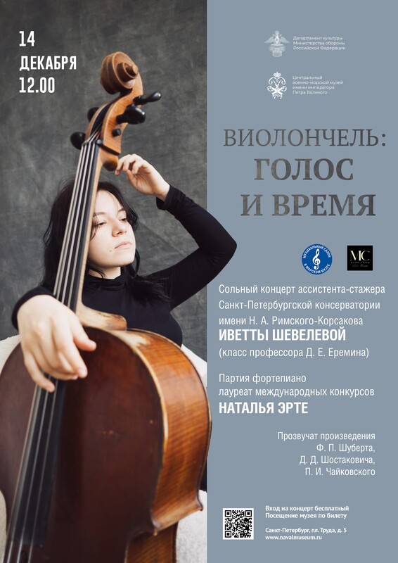 14 декабря в 12 часов в стенах Морского музея состоится сольный концерт «Виолончель: голос и время» в исполнении ассистента-стажера Санкт-Петербургской консерватории имени Н.А. Римского-Корсакова Иветты Шевелевой (класс профессора Д.Е. Еремина). Партия фортепиано лауреат международных конкурсов Наталья Эрте.