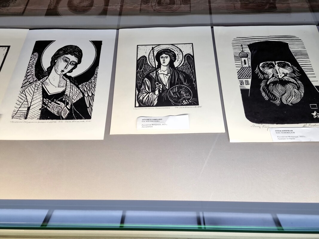 Идейным центром и смысловым прологом выставки стала линогравюра «Защитники Отечества разных эпох». Монументальная по замыслу работа связывает в единый нарратив различные периоды российской истории, подчеркивая преемственность воинской традиции и духовных ценностей.