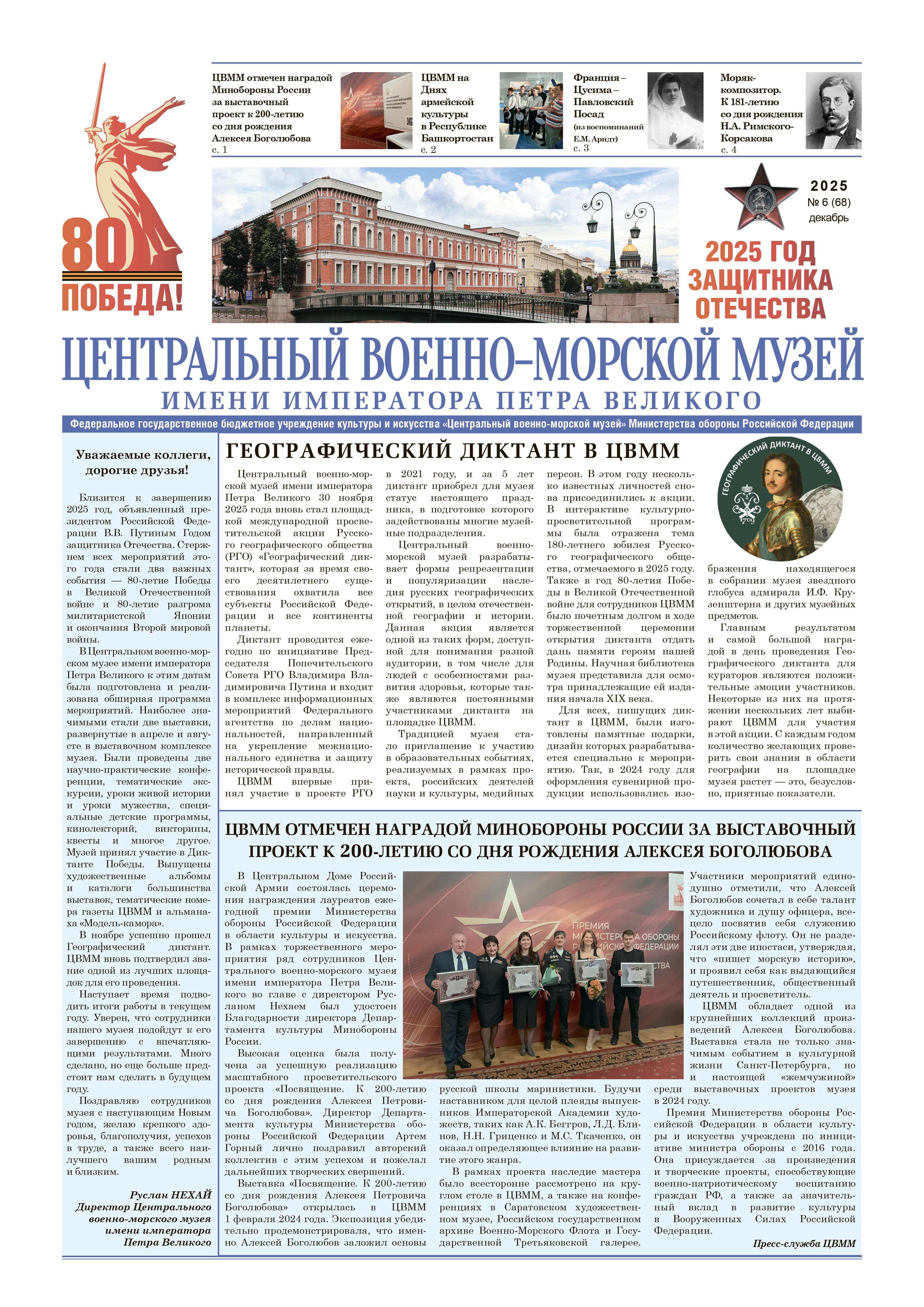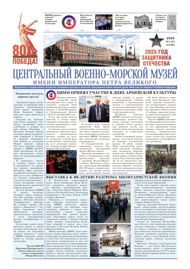 о торжественно-траурных мероприятиях, посвященных 70-летию со дня гибели линкора "Новороссийск", в котором приняли участие сотрудники двух филиалов ЦВММ "Музей Черноморского флота" и "Корабль боевой славы "Михаил Кутузов" о том, как проходили в Итальянском дворце (филиал ЦВММ "Кронштадтская крепость") методические занятия по изучению фондов и мастер-классы для жителей Кронштадта; о "Детских днях-2025" в ЦВММ; об открытии выставок в филиалах ЦВММ, праздновании Дня народного единства и др.